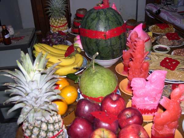 ภาคเช้า เจ้าบ้านเตรียมผลไม้ ๓ / ๕ / ๗ ชนิดตามจำนวนที่ศรัทธาเพื่อสักการะเทพเจ้าทั้งสามแห่ง โดยเฉพาะที่หน้าเตาไฟในครัวคือ เทพจ้าวฮุ่นกง