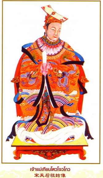 เจ้าแม่ทับทิม หรือ แม่ย่านางเรือ หรือ เทียนเฟย หรือ มาจู่ ( 媽祖 )มาจอโป๋ เป็นชื่อที่คนไทยคุ้นเคย นั่นก็คือ ชื่อหนึ่งของ สมเด็จพระราชเทวีเทียนโหวโจวโกว พระประวัติของท่านมีการบันทึกไว้หลายตำนาน แต่ส่วนใหญ่แล้วจะใช้เอกสารของ เส่งบุ๋น ซึ่งเป็นทายาทของตระกูลสายเจ้าแม่ทับทิมเป็นหลัก หนังสือดังกล่าวชื่อ พระประวัติเจ้าแม่เทียนโหวโจวโกว แต่อย่างไรก็ตามพระประวัติในส่วนปลีกย่อย ที่บุคคลต่างๆได้ประสบและบันทึกไว้นั้นมีมากมาย ทั้งที่เป็นบันทึกของทางราชสำนักคือจดหมายเหตุ และบันทึกของขุนนางเสนาบดีในราชสำนักจีน เอกสารเหล่านี้ล้วนมีคุณค่าต่อการศึกษาด้านวัฒนธรรมและสังคมเป็นอย่างดี